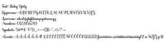 Baby Girly Script เป็นฟอนต์สคริปต์ที่น่ารักซึ่งออกแบบมาสำหรับผู้ที่ต้องการเติมเต็มโปรเจกต์ของตนด้วยสัมผัสของความสนุกสนานและความสง่างาม ฟอนต์นี้มีรูปแบบตัวอักษรที่ไหลลื่นประดับด้วยเส้นโค้งที่ละเอียดอ่อนและลูปที่สง่างาม ทำให้เป็นตัวเลือกที่เหมาะสมสำหรับการเพิ่มความเป็นผู้หญิงให้กับการออกแบบต่างๆ ครอบครัวฟอนต์นี้มีหลากหลายสไตล์ ตั้งแต่ความหนาที่ชัดเจนไปจนถึงตัวเลือกที่มีเส้นขอบและพื้นผิว ช่วยให้สามารถทดลองสร้างสรรค์ได้ในขณะที่ยังคงรักษาความนุ่มนวลของฟอนต์ไว้